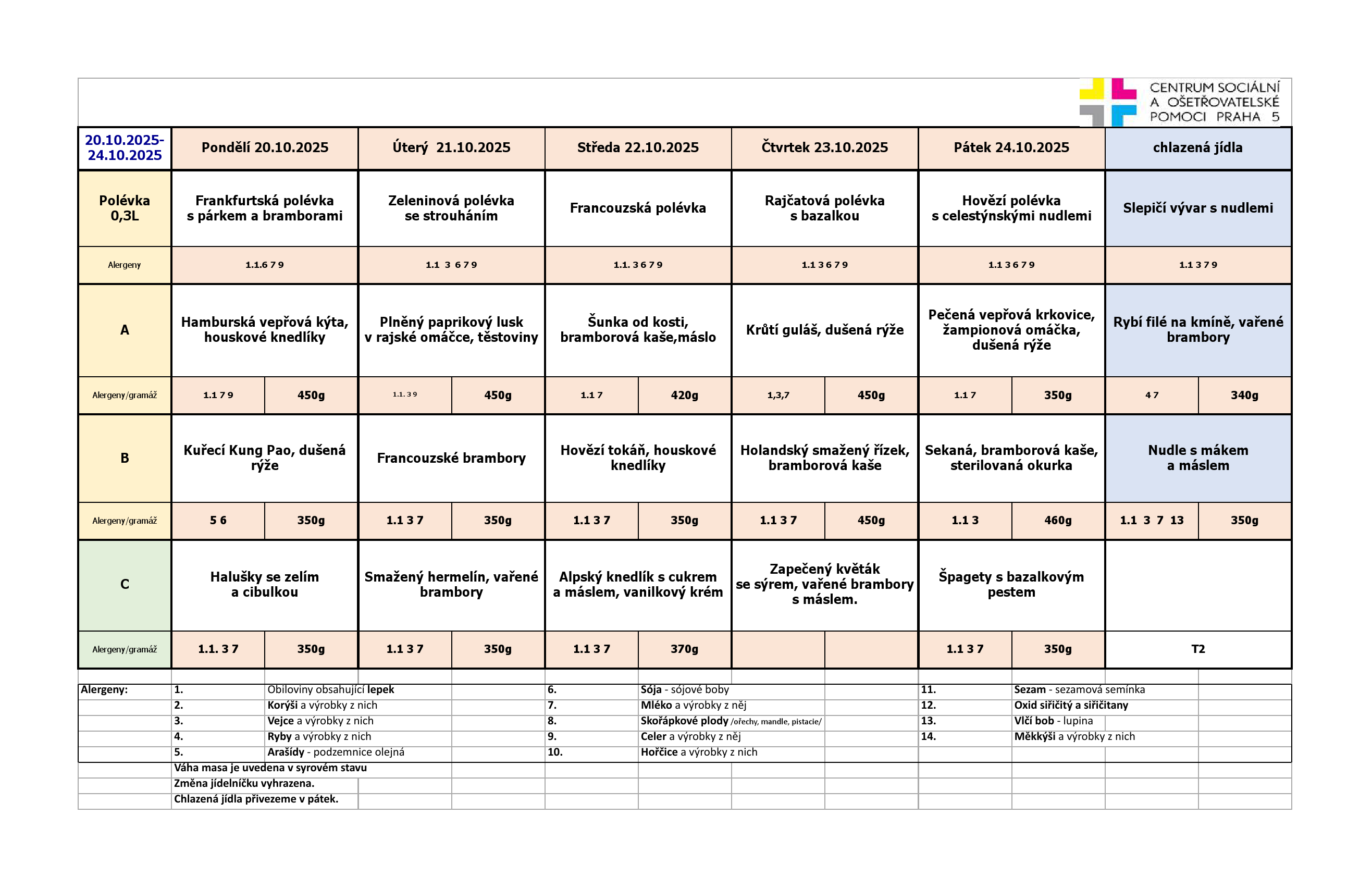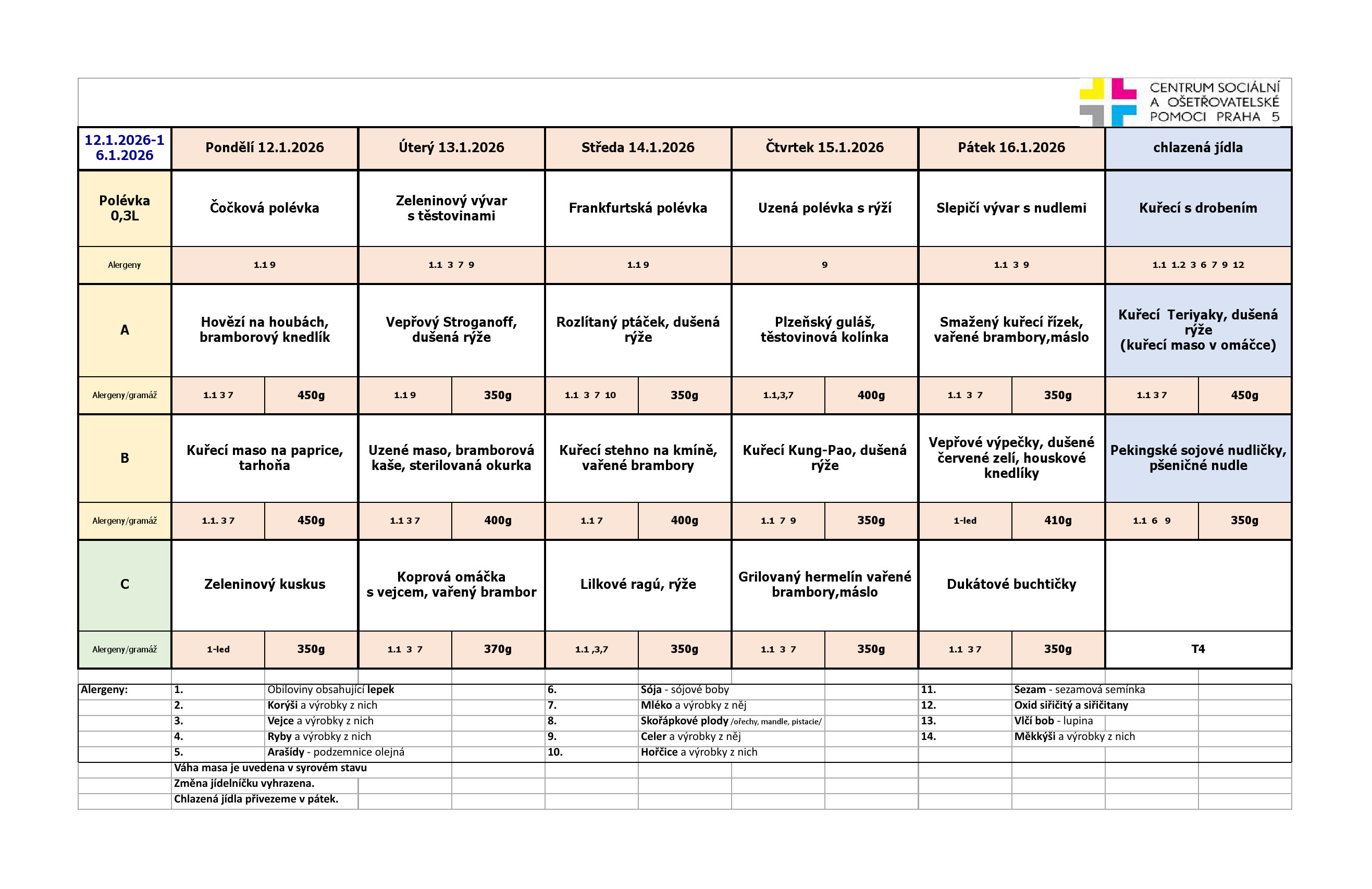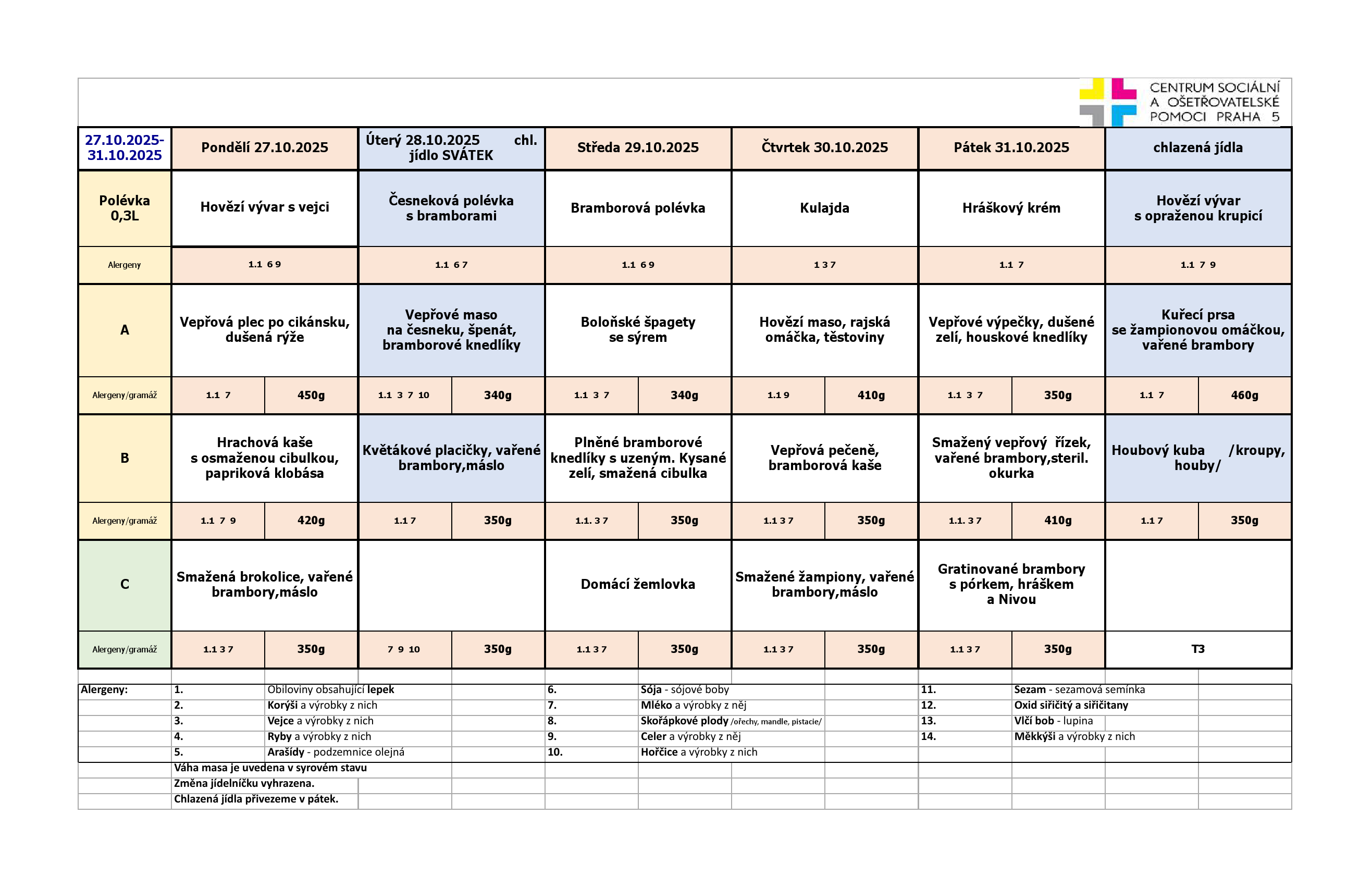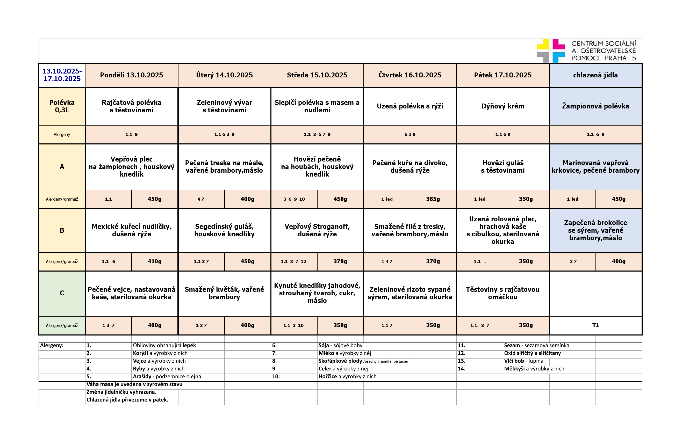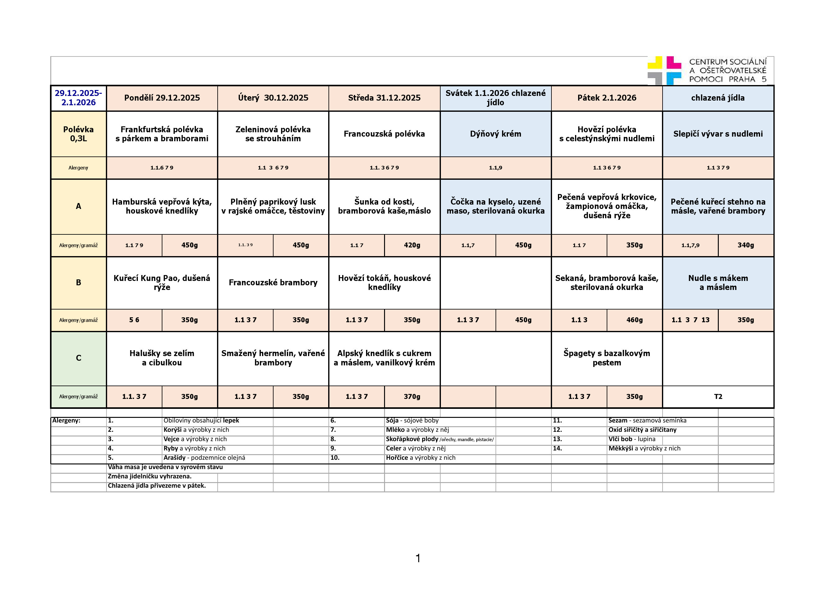Od pondělí do pátku je na výběr ze tří jídel. Klienti pečovatelské služby, kteří chtějí zajistit stravu na víkend a státní svátky, si mohou objednat chlazená jídla. Obědy si klienti objednávají na měsíc dopředu z jídelních lístků, které jsou k dispozici jak v tištěné formě, za poplatek 2,- Kč/kus, tak v digitální formě, zasílány e-mailem, nebo jsou k dispozici na našich webových stránkách.