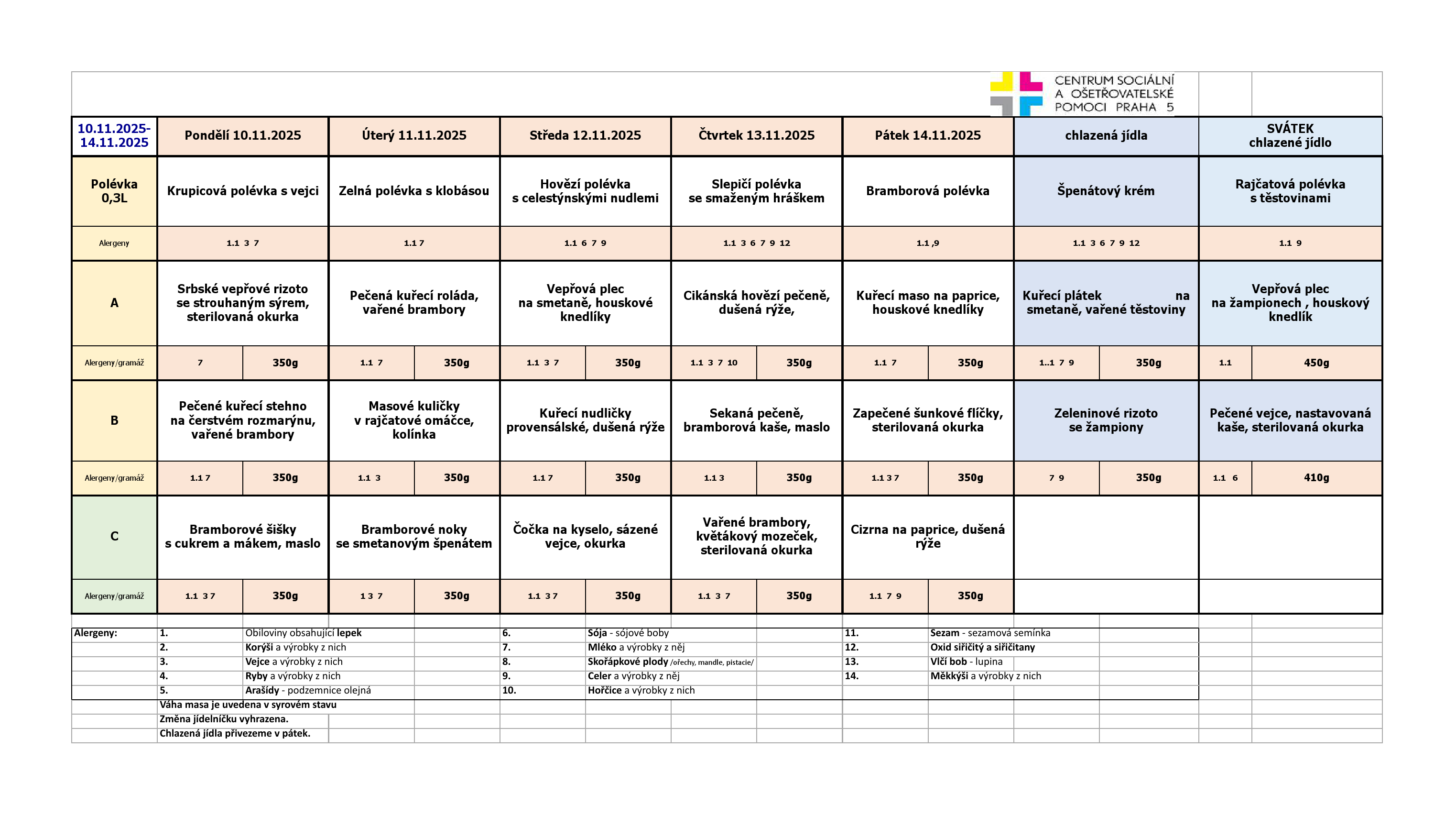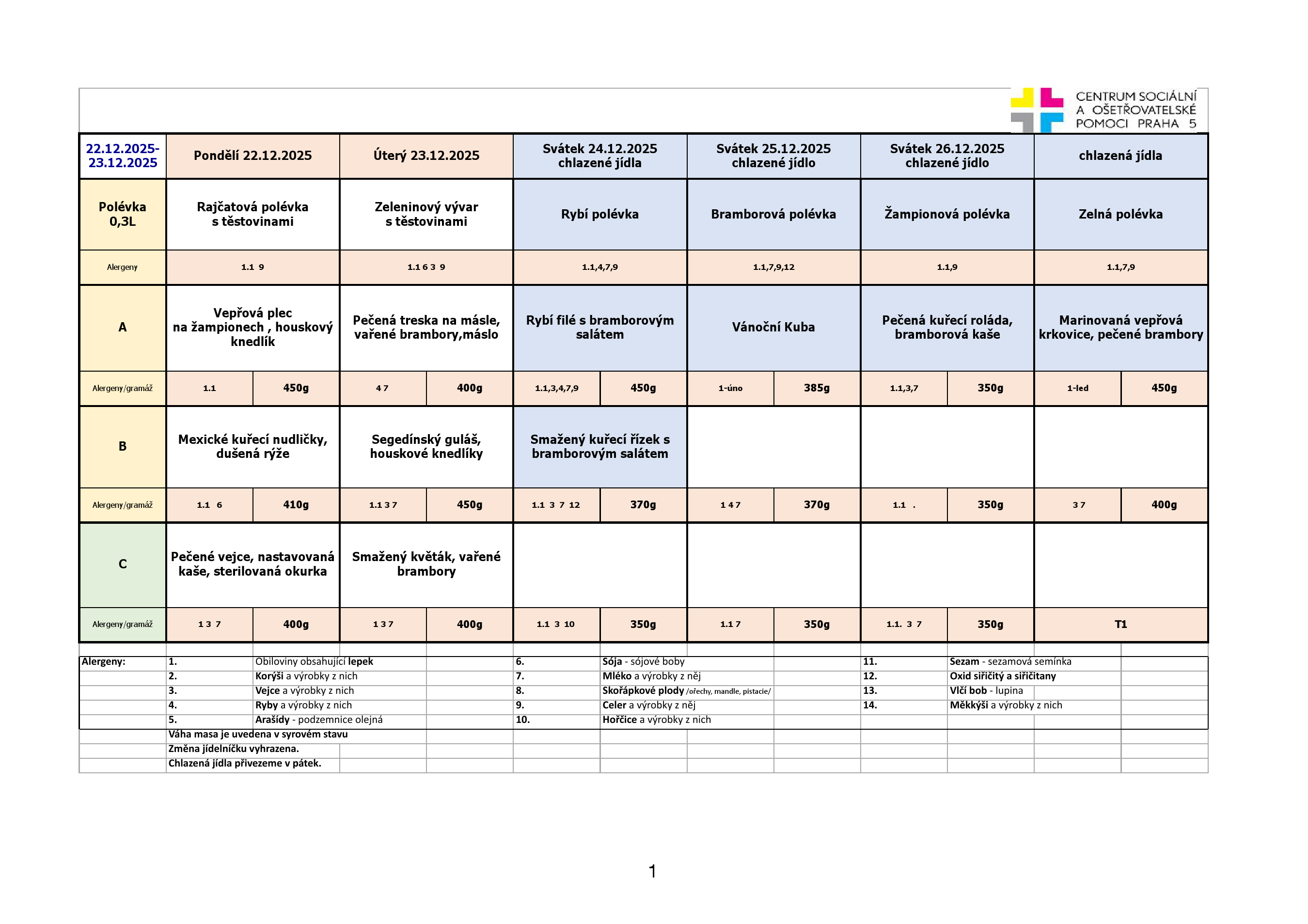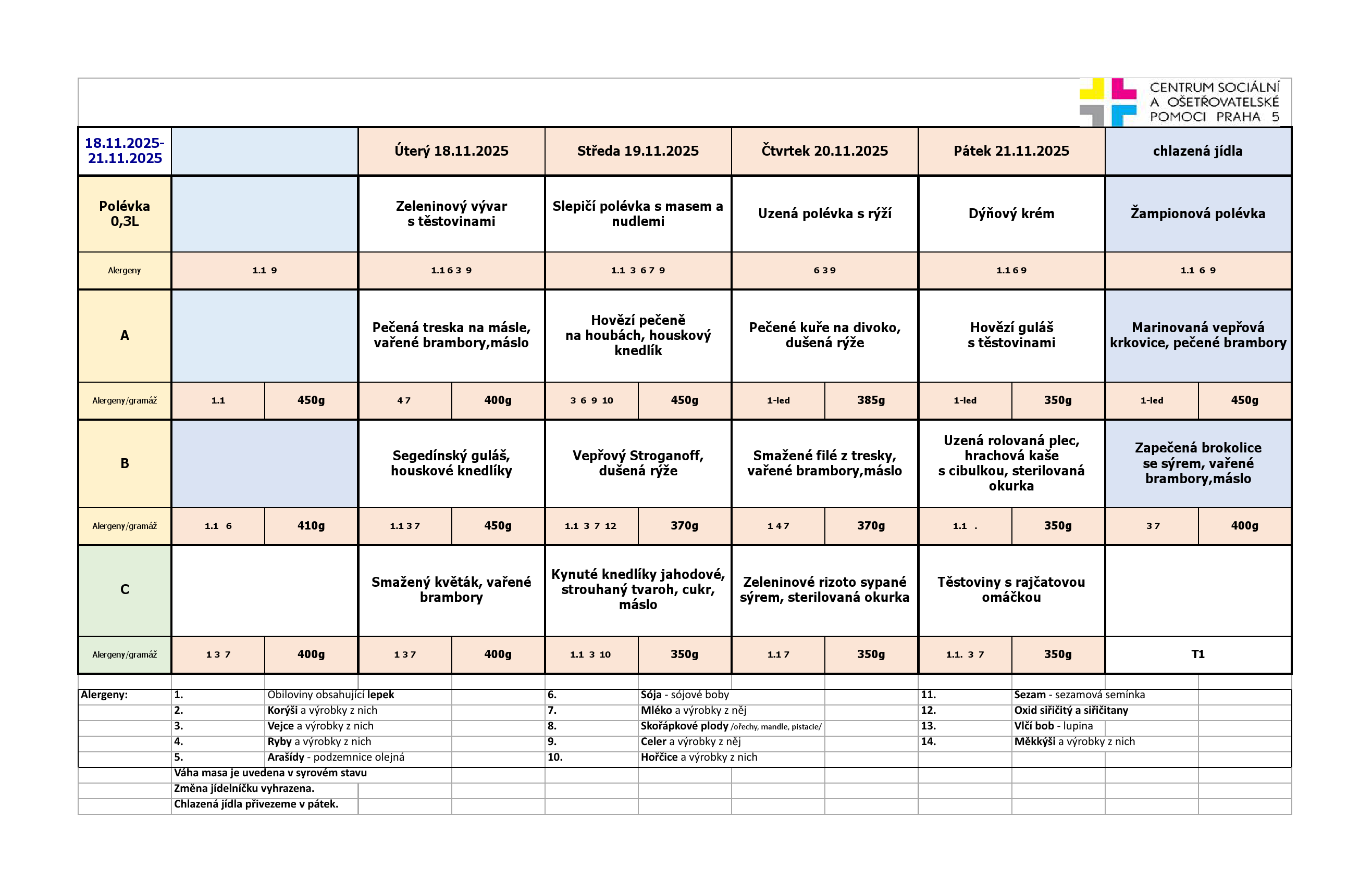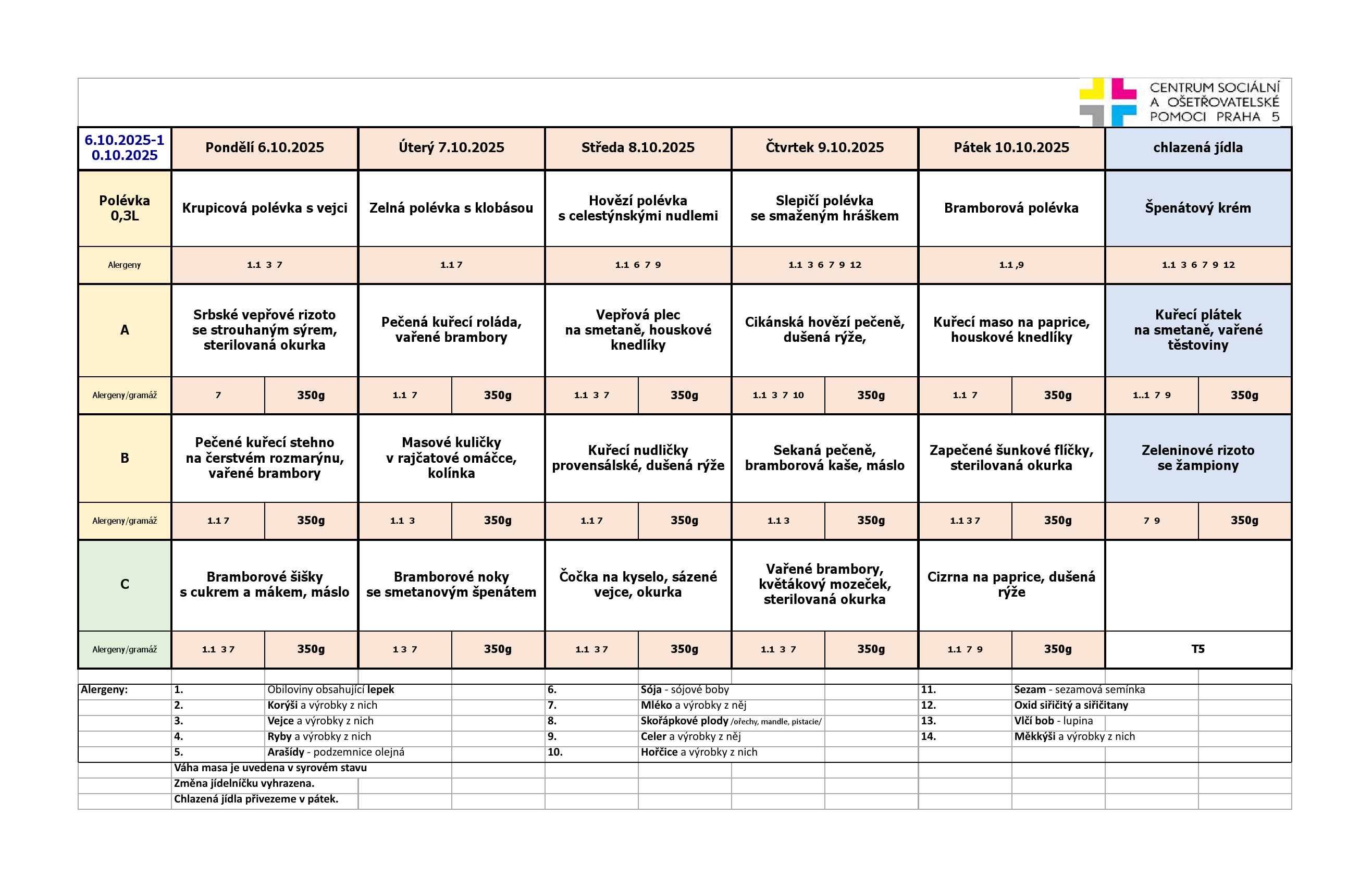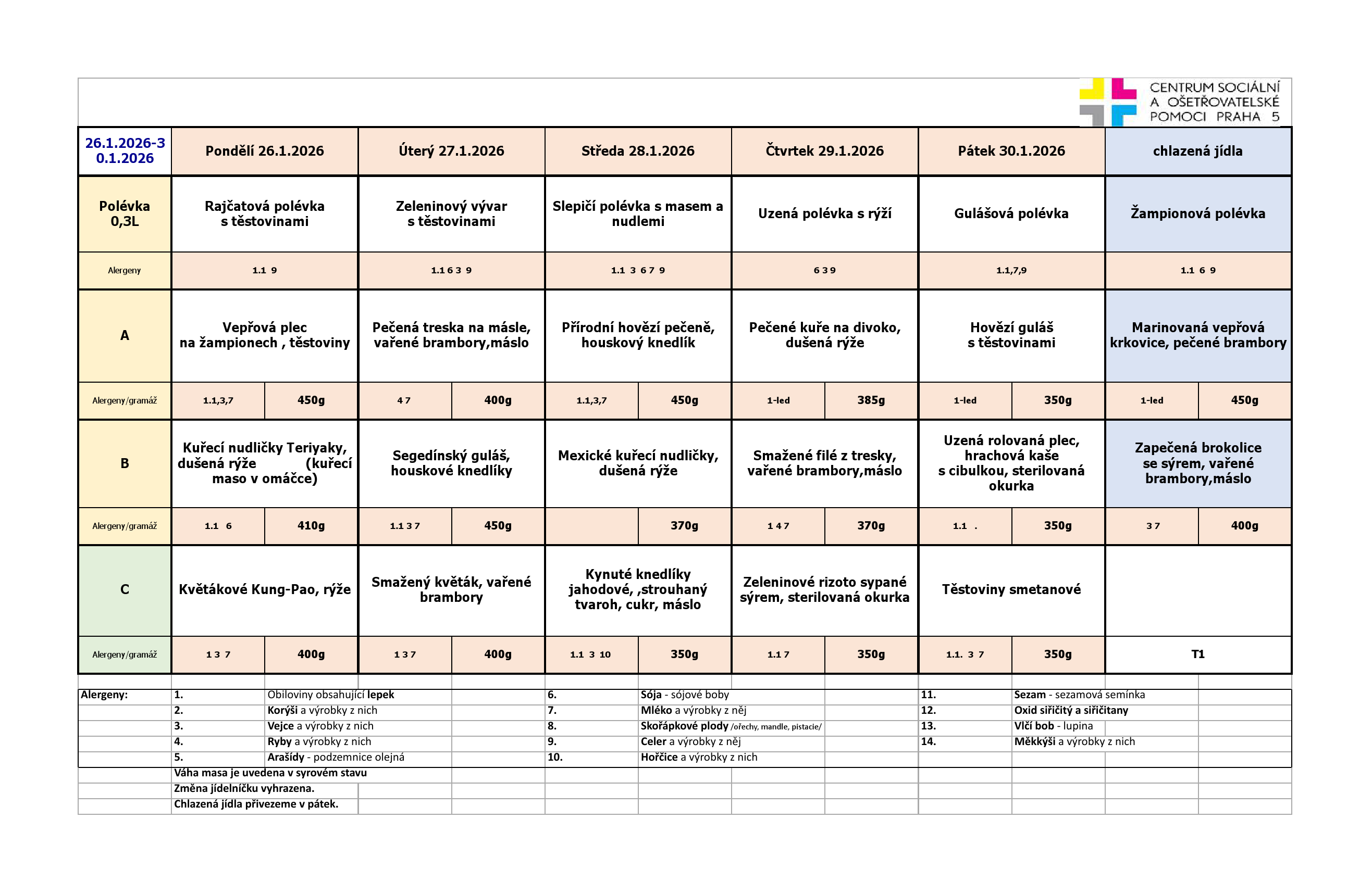 Od pondělí do pátku je na výběr ze tří jídel. Klienti pečovatelské služby, kteří chtějí zajistit stravu na víkend a státní svátky, si mohou objednat chlazená jídla. Obědy si klienti objednávají na měsíc dopředu z jídelních lístků, které jsou k dispozici jak v tištěné formě, za poplatek 2,- Kč/kus, tak v digitální formě, zasílány e-mailem, nebo jsou k dispozici na našich webových stránkách.