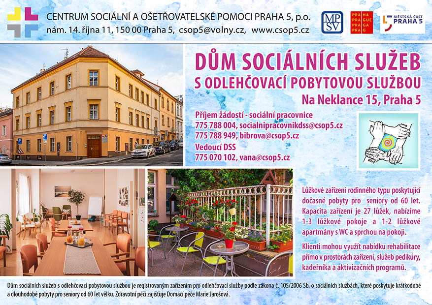 Pro ty, kteří potřebují zajistit pobyty pro seniory v období předvánočním a v době vánočních svátků, nabízíme poslední volná místa v pobytové odlehčovací službě v centru Prahy 5, Na Neklance 15 (dostupnost MHD, zastávka tram. 7, 21, Braunova). Kontaktujte naše sociální pracovnice na tel. 775788004 nebo 775788949, možno domluvit se na osobní návštěvě služby.